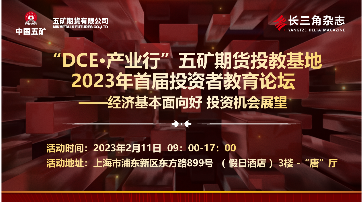 五矿期货有限公司(下简称“五矿期货”)积极贯彻落实国家战略规划,服务于中国式现代化强国建设,充分发挥五矿集团及五矿期货优势和服务特色,为切实做好期货投资者教育工作,大力开展投资者教育基地建设。2月11日,五矿期货与《长三角》杂志社联合主办的 “五矿期货投教基地2023年首届投资者教育论坛——经济基本面向好 投资机会展望”主题论坛于上海浦东假日酒店“唐”厅顺利举办。本次论坛邀请到三位嘉宾来分别对2023年宏观经济形势以及期货期权方面的展望进行深度的讲解。